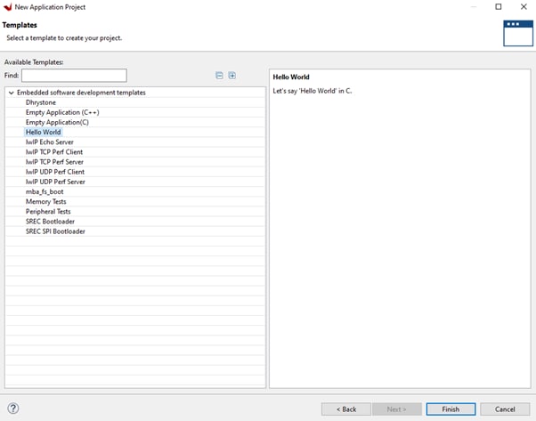 In Vitis, create a new application project, target the just exported XSA, and select the “Hello World”