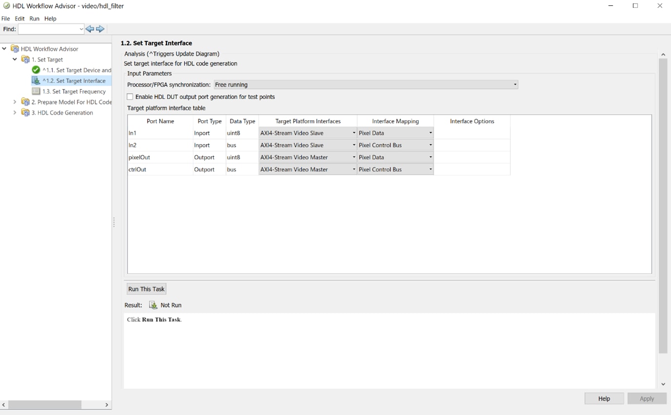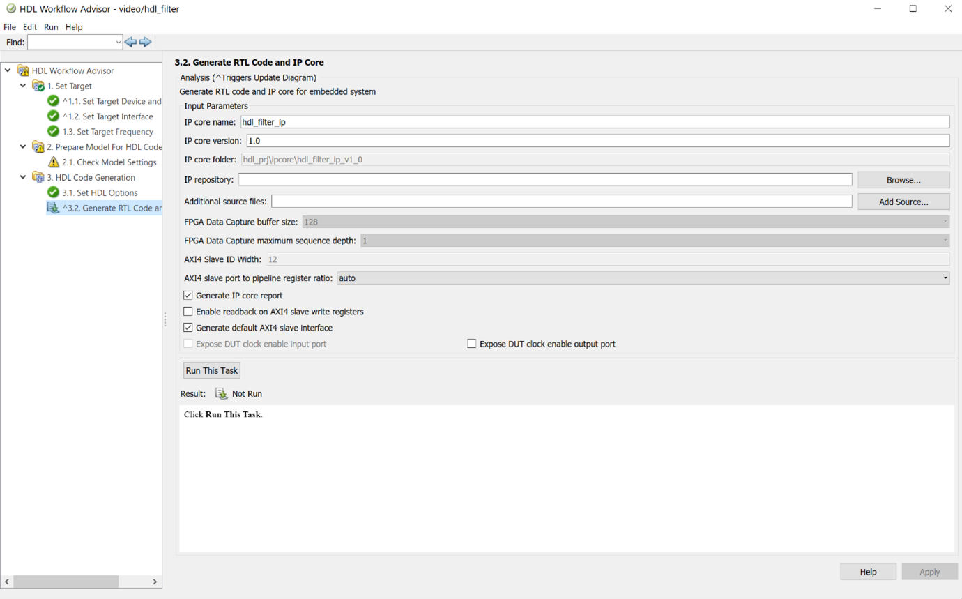 To generate the HDL, we can use the HDL Workflow assistant with the SoC Blockset to generate an IP module that has