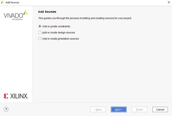 Add the XDC constraints, which define the pins. Select “Add Sources” and select constraints