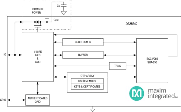 Figure 3: Block diagram of the Maxim Integrated DS28E40 DeepCover® Automotive 1-Wire Authenticator. (Source: Maxim Integrated)