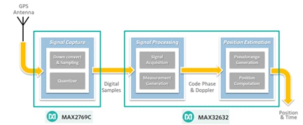 It is helpful to think of receiving the satellite signal to obtaining the position coordinates as a three-step process: Signal Capture, Signal Processing, and Position Estimation (Figure 1). In addition to the low-power consumption, the Maxim/BTI solution provides the flexibility to perform both the signal processing and the position estimation steps either on or off the board by offloading to a cloud server. This can further reduce both the power consumption and the system’s cost.