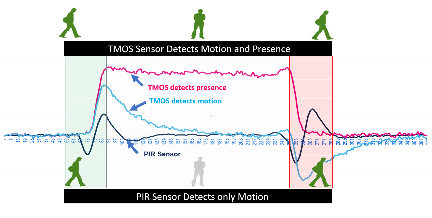 Figure 1: The difference in presence and motion detection using PIR vs. TMOS (Source: STMicroelectronics)