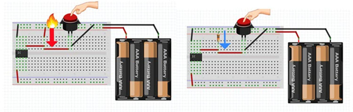 Figure 1: Just running a wire allows for a short circuit (Left). A pull-up resistor prevents floating inputs while as preventing an unwanted short circuit (Right). (Source: Author)