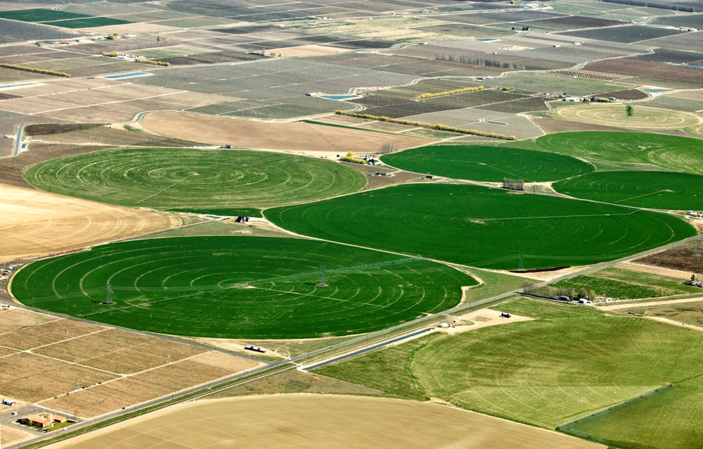 But, what if we could eliminate the tractor entirely by employing robotics and Internet of Things (IoT) technologies? One interesting way to do this can be inspired by center-pivot irrigation systems, where a central tower supplies water, and one end of a long string of pipes is attached to it with a pivot, while the other end slowly travels around to make a large circle. Segments of pipe are suspended by trusses between a series of towers, with variable-speed drive wheels that are controlled to keep the pipeline straight. Sprinkler heads distributed along the pipe irrigate the crops below. Typical center-pivot systems are a quarter of a mile (400 meters) in radius. To see this technology in action, take a look at a satellite image of the croplands in the region of Ogallala, Nebraska.