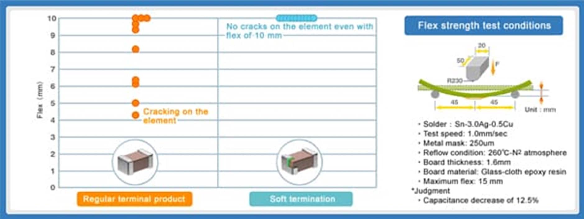 In comparative tests, multi-layer inductors and chip beads with resin electrodes have demonstrated almost twice the flexural strength (critical deflection) of products with conventional electrodes. With conventional products, cracks appear on the ceramic element at a bend of about 4mm. Soft termination products, on the other hand, can withstand a 7mm bend.