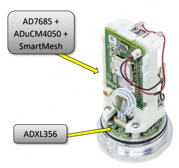 The CbM hardware signal chain consists of a three-axis, ultra-low power, ultra-low noise ADXL356 MEMS accelerometer mounted to the module’s base. The outputs of the ADXL356 are conditioned and converted to digital with three low-power AD7685 16-bit daisy chain ADCs. The ADC outputs are buffered and transformed to the frequency domain in the ADuCM4050 low-power microcontroller and from there streamed to the SmartMESH IP mote (Figure 2).