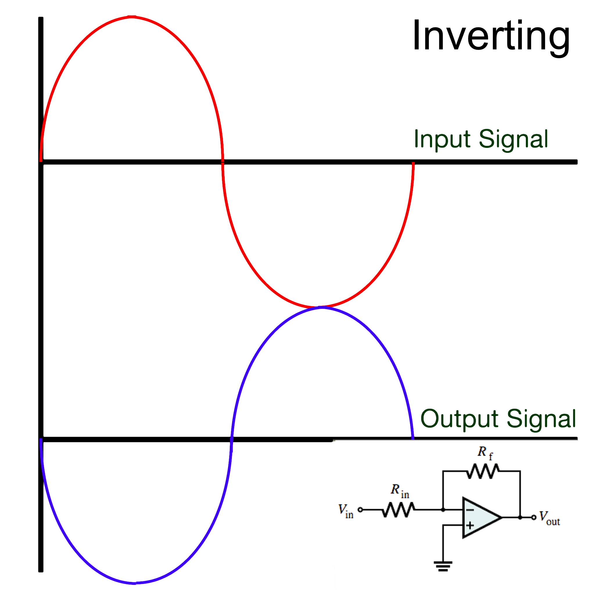 Two basic op amp configurations are known as “non-inverting amplifier” and “inverting amplifier”. The output of the non-inverting amplifier will remain in phase with the input signal, while the output of the inverting amplifier is 180-degrees out of phase. Both configurations take advantage of a design technique known as “negative feedback” which take the output signal and through a resistor network feeds it back into the inverting input. This is what allows amplification to occur. The non-inverting configuration feeds the input signal into the non-inverting (+) input of the op amp.  Conversely, with an inverting configuration, the signal is fed in through the inverting (-) terminal.