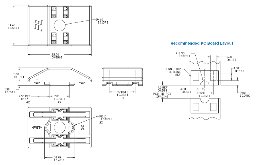 2位置連接 組件 連接器組件 能透過螺絲固定於散熱器並裝配到鄰近的印刷電路板上,其電氣觸點完全插穩入印刷電路板焊墊連接器組件 能裝配到寬度為16.50mm [.650]印刷電路板7.0mm [.276]印刷電路板間距 連接器組件 具有配準功能,能對準印刷電路板的開孔#6螺絲(需另購)可用於將連接器 組件 固定於散熱器或基座的螺絲孔。 #6螺絲需具有鍍鋅或相同等級的保護塗層,以防止鏽蝕 客戶自備#6螺絲 管式包裝組件 符合RoHS規定 相關產品:端蓋及表面黏著組件 產品尺寸