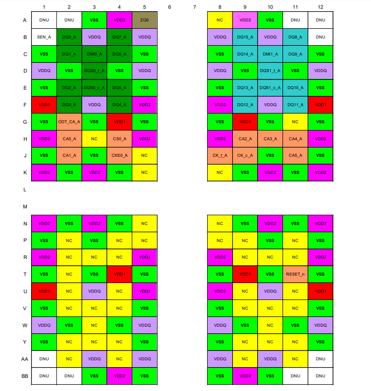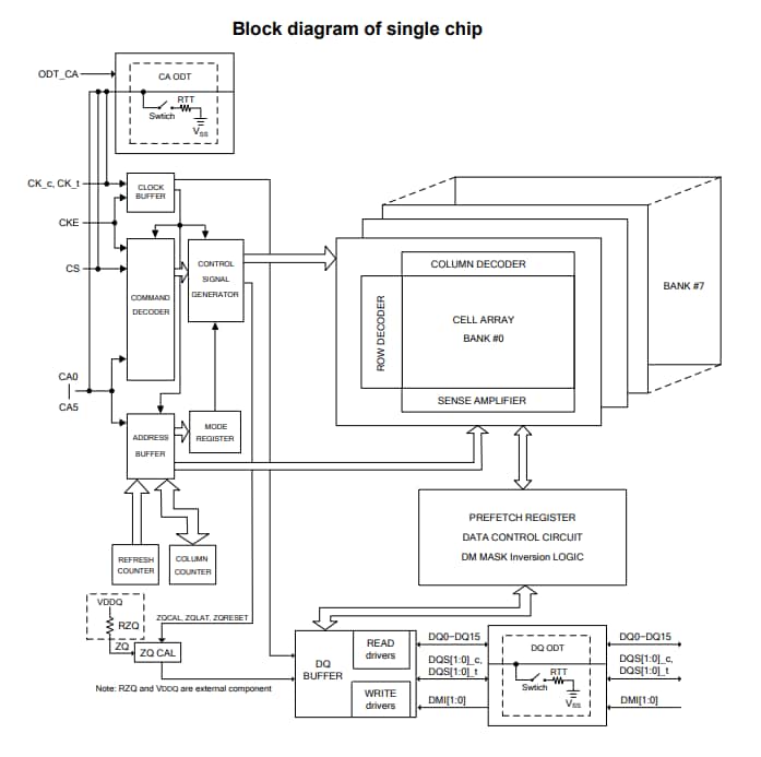 單晶片封裝 (SDP) 提供16 Mb x 16 DQ x 8 Bank x 1通道,密度為2 Gb(2,147,483,648位元)。雙晶片封裝 (DDP) 提供16 Mb x 16 DQ x 8 Bank x 2通道,密度為4 Gb(4,294,967,296位元)。